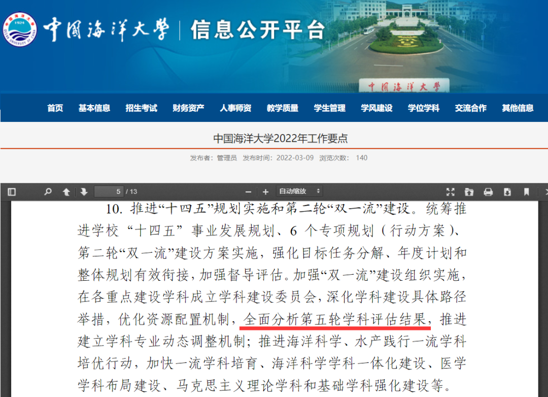 2022年3月,中国海洋大学信息公开平台发布2022年工作要点。文件提到:全面分析第五轮学科评估结果,推进建立学科专业动态调整机制。
