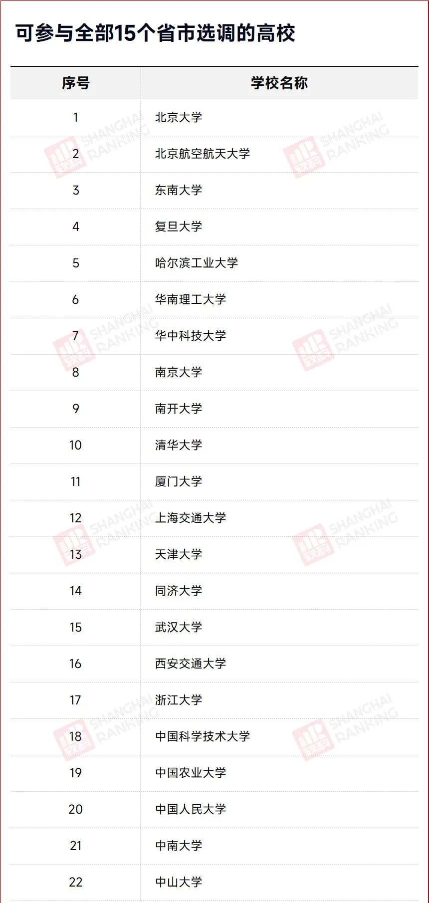 通过对选调高校范围明确的15个省市数据分析后发现,有22所高校获得了全部15个省市的青睐,具体见下图: