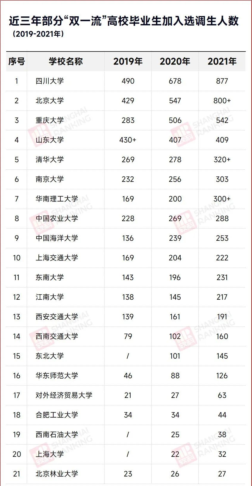 在部分“双一流”高校2019-2021年三年的就业质量报告中,可以发现多数高校加入选调生的人数均有所增加。