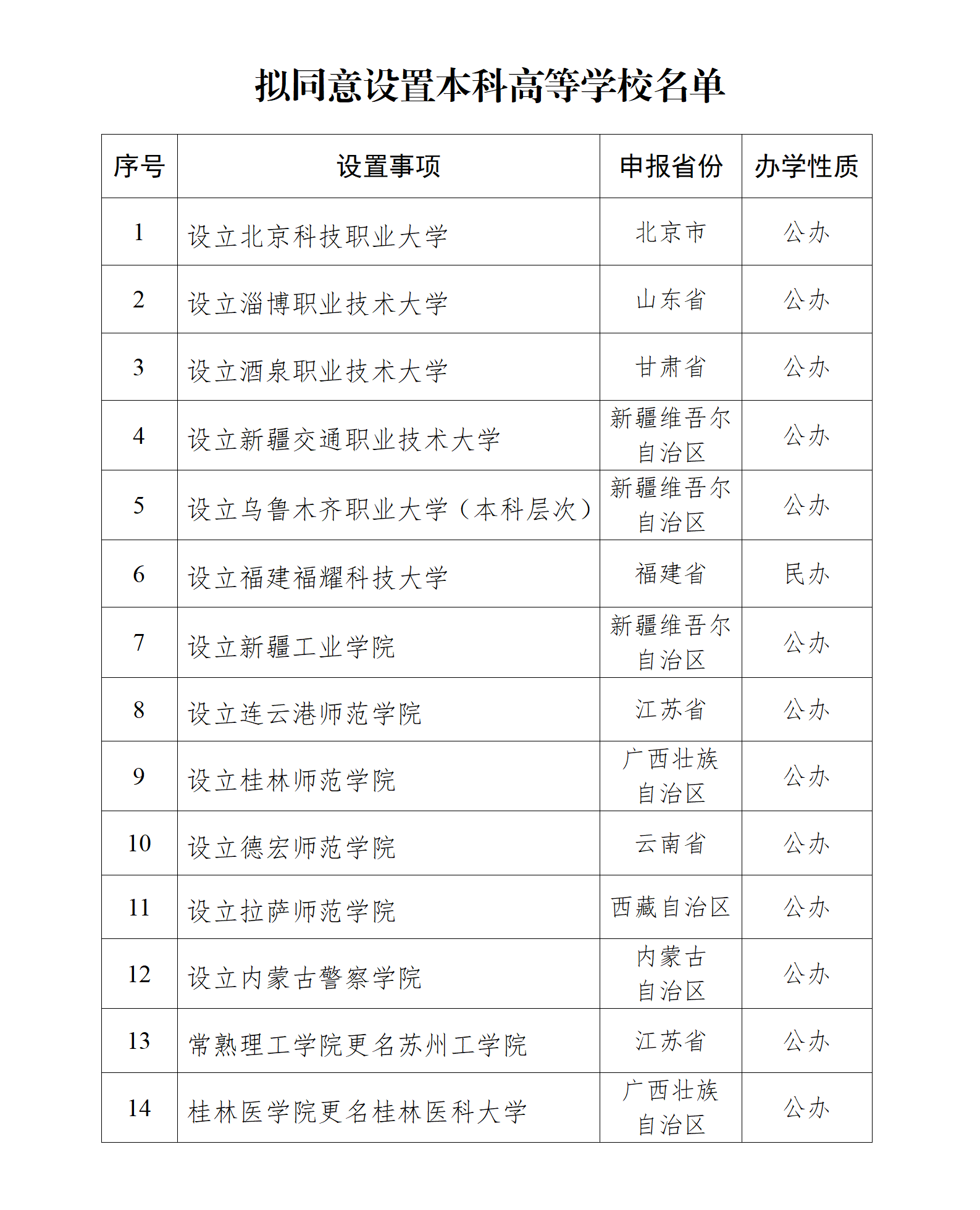 拟同意设置北京科技职业大学等14所学校,其中2所高校更名,